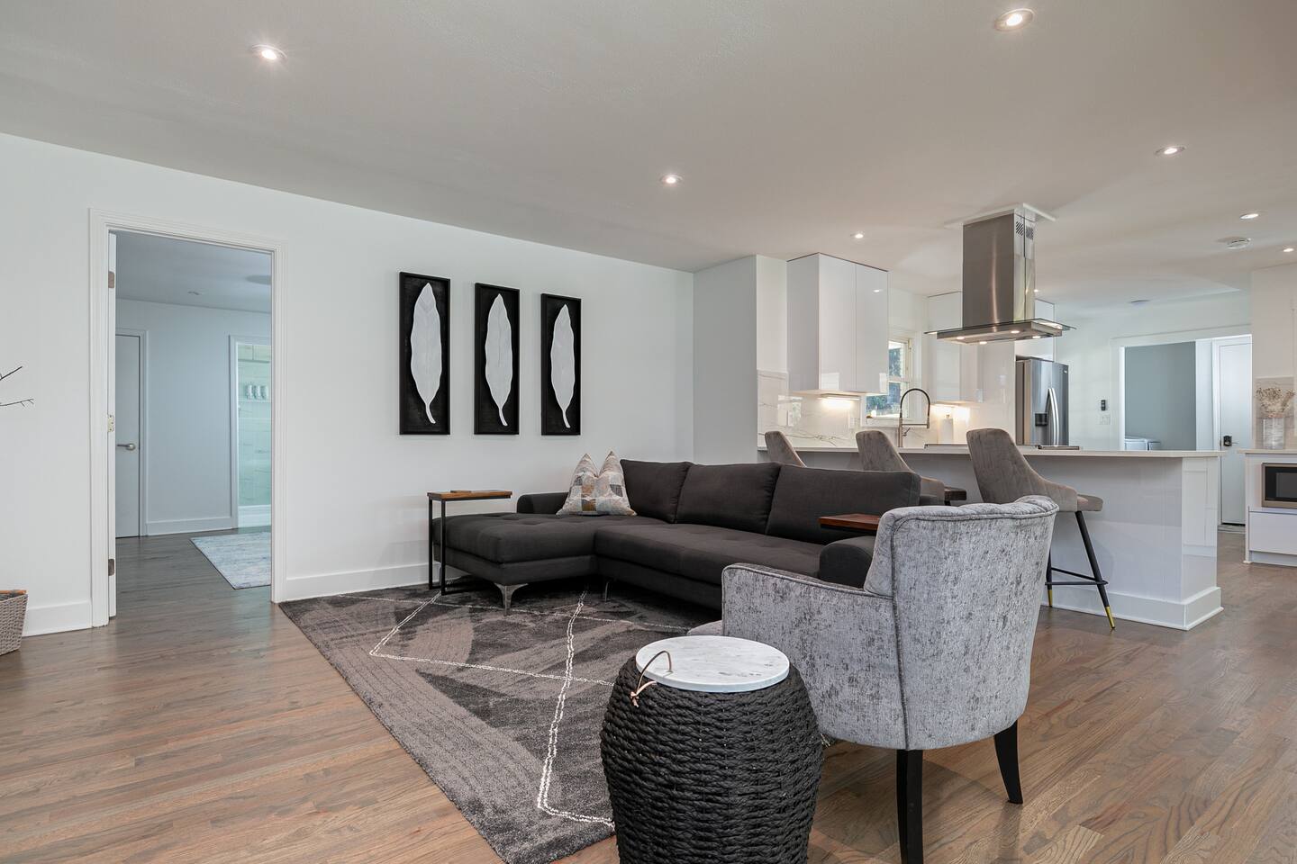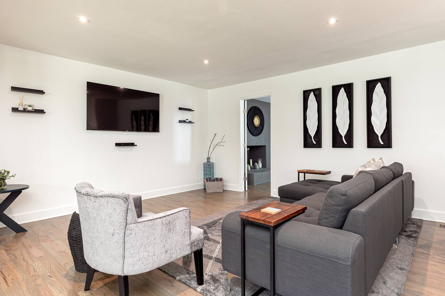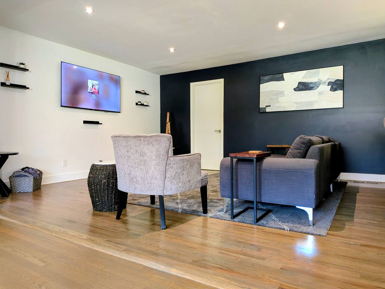 Welcome to The Oak Tree Oasis - a gorgeous, upscale 4 bedroom escape featuring two master suites including a Grand Master Bedroom and double vanity bathroom! Seated quietly behind a giant Oak Tree, this modern home features an open floor plan in the main living space, flat screen smart TVs in every room, a welcoming dining room space, and complimentary tea, coffee, wine and snacks. Enjoy the covered back patio while viewing the serene nature of the expansive backyard. Escape to tranquility!